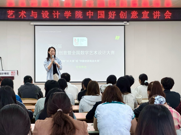 为助力学院学子深入了解专业赛事动态,明晰参赛方向,提升作品竞争力,艺术与设计学院于9月22日上午开展“中国好创意暨全国数字艺术设计大赛”宣讲会。本次宣讲会特邀中国好创意暨全国数字艺术设计大赛组委会秘书王馨蕊老师主讲,吸引学院本科生、研究生共90余人参加。学院党委副书记张恬、副院长昌隽如、视觉传达设计专业教师王雅鸣和研究生辅导员赵子萍共同出席。