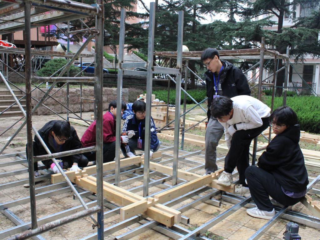 预搭建作为大赛的重要前期环节,不仅帮助学生适应现场条件、优化施工流程,也促进了跨校团队之间的技术交流与协作。大赛将于10月12日正式开幕并进入集中搭建阶段;10月13日下午进行现场评审与闭幕颁奖。五件实体建造作品“万象亭”“鼎晷”“树脉筑忆”“枕虹隅”“博园·树亭”将在青岛理工大学市北校区落地生根,成为校园文化新景观,持续见证学院以赛促学、以赛促教的实践成果与创新活力。(撰稿:王文卿;审核:王中帅)