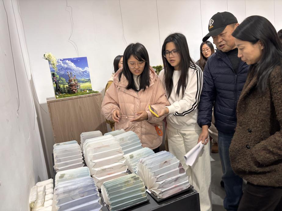 展览现场交流氛围活跃。学生向到场教师展示作品的制作过程、结构原理及交互功能,教师们在充分肯定作品完成度的同时,也从功能完善、材料应用、交互逻辑与细节优化等方面提出了专业建议,现场讨论热烈而富有成效。