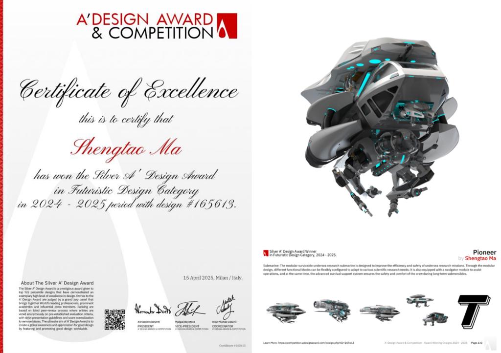 近日,2025年意大利A设计奖(A'Design Award & Competition)获奖名单正式揭晓。艺术与设计学院2024级设计专业研究生马圣涛在指导教师王春鹏、朱宏轩、赵光明的指导下凭借作品《Pioneer Submarine》从全球参赛作品中脱颖而出,斩获2024-2025年度意大利A设计奖银奖。这一国际殊荣不仅是对学子个人创造力的高度认可,更彰显了学院设计教育的国际影响力。