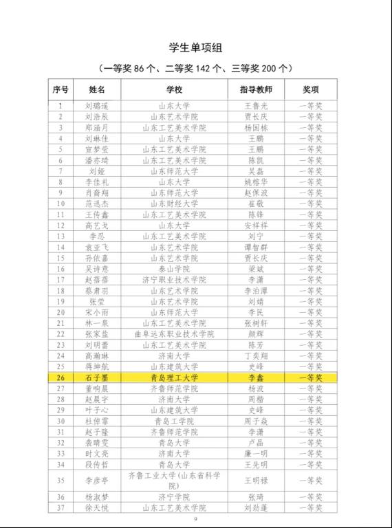 此次获奖既是对石子墨同学个人专业能力的肯定,也是指导教师李鑫教授悉心培育的有力见证,更是学院长期重视学科竞赛、深化教学改革的丰硕成果。下一步,艺术与设计学院将持续优化人才培养模式,强化专业技能与创新思维的协同培育,助力更多学子在艺术道路上砥砺前行,为国家美育事业发展与文化创新建设贡献力量。(撰稿:李鑫,赵子萍;审核:张恬)